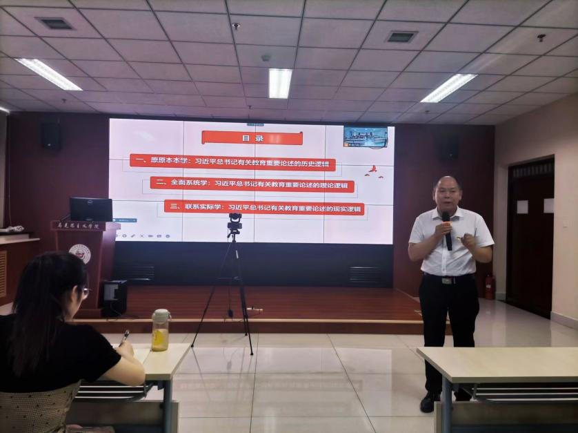 王强围绕立德树人这一根本任务,从三个方面阐释了青年学子应当如何学习好、领会好、落实好习近平总书记关于教育工作的一系列重要论述,一是要把握历史逻辑,原原本本学,深入学习马克思主义经典著作和习近平总书记系列重要讲话精神,不断提高理论素养;二是要把握理论逻辑,全面系统学,明确教育是国之大计、党之大计;三是要把握现实逻辑,联系实际学,做到“六个下功夫”,做德智体美劳全面发展的社会主义建设者和接班人。最后,他勉励各位党员要勤学苦练,炼就真本领,以后走上工作岗位要学会用教材语言、学术语言、政治语言讲述思政课,把思政课讲深、讲透、讲活,做一名合格的思政教育工作者。