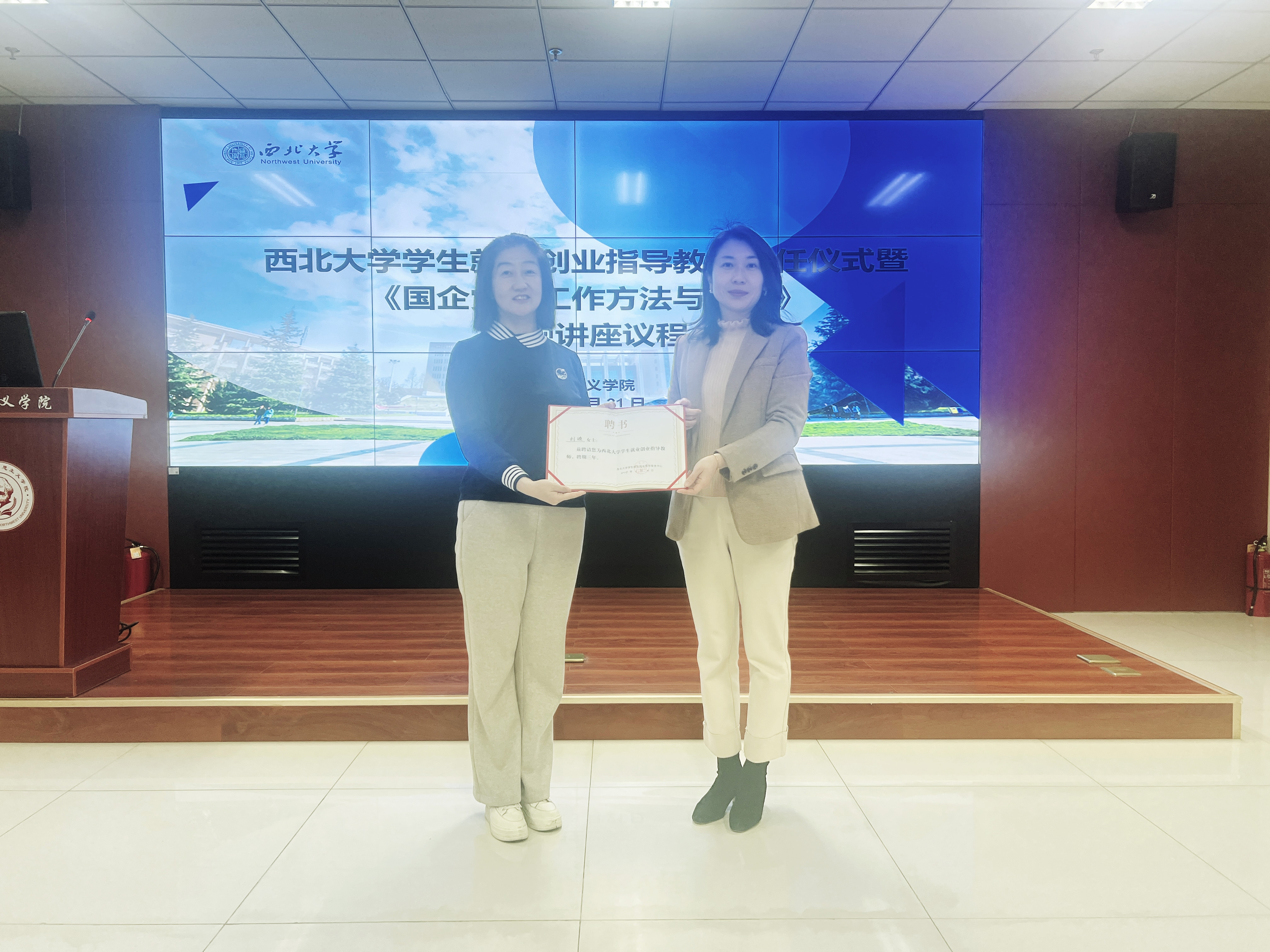 丁莹莹为刘璇颁发新葡的京集团8814检测站学生就业创业指导教师聘任证书。