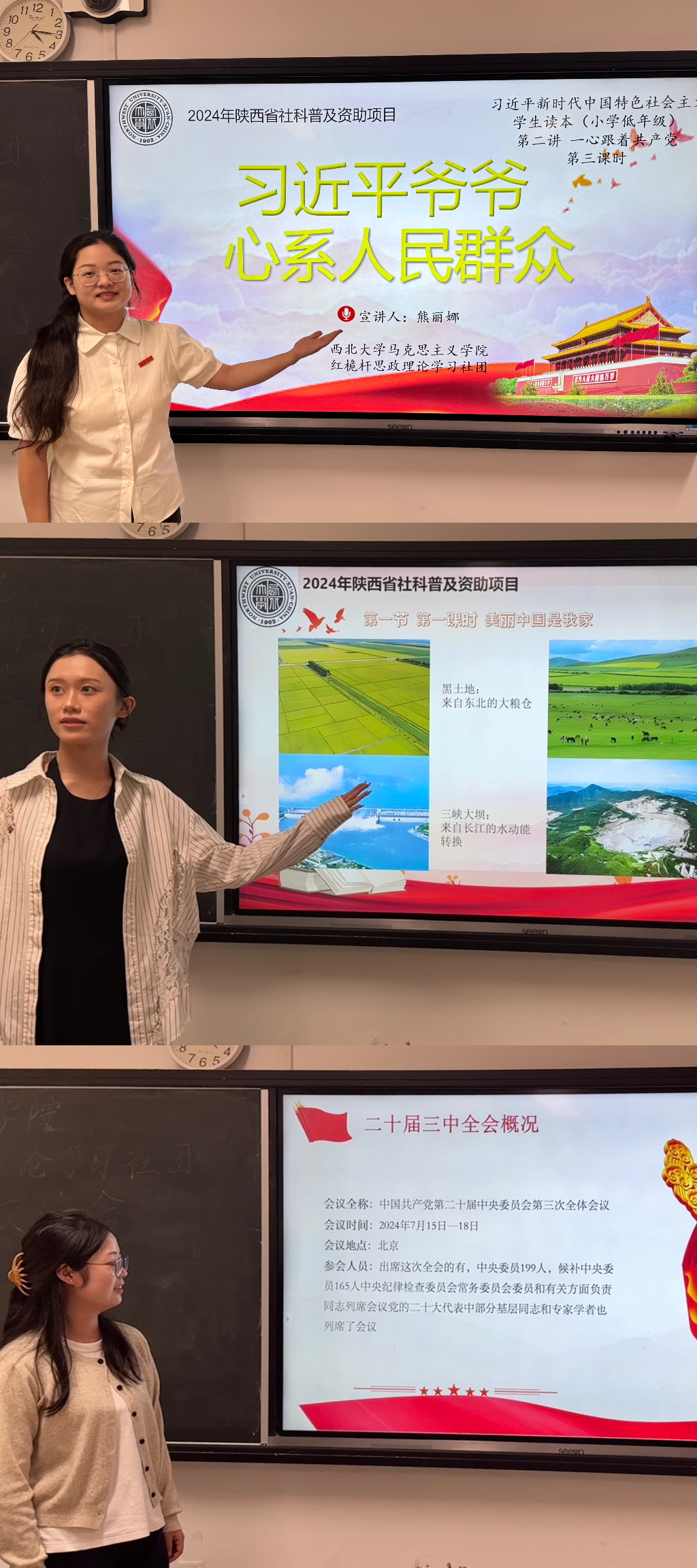 社团成员2024级思想政治教育专业硕士研究生熊丽娜、马克思主义中国化研究专业硕士研究生陈慧荣、思想政治教育专业硕士研究生马俊,分别围绕《习近平新时代中国特色社会主义思想学生读本》(小学低年级)不同章节和二十届三中全会相关主题进行了讲课展示。
